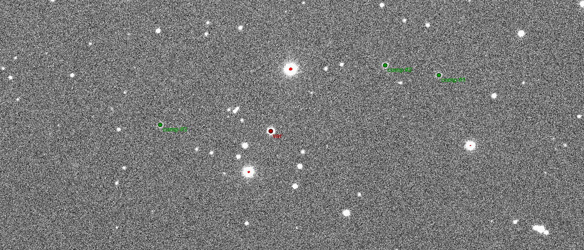 An example of a raw picture taken is given above, which shows some of the stars marked. The brightness of the stars marked in green, called comparison stars, is averaged and compared to the brightness of BN Tri marked in red and annotated ”var”. This relative brightness plotted over time results in the light curve shown on the right.