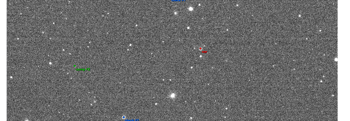 The picture above shows a raw image of the observation with only the positions of our desired object and some check and comparison stars being added. Those additional stars are important as the underlying method is the differential photometry. Therefore, their and RV Ari’s brightness were related.