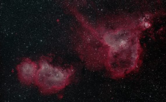 Time for another wide-field image using the Samyang telephoto lens that rides piggy-back on the main scope at our TURMX setup. This is the heart and soul nebula, IC1805 and IC1848, in the constellation Cassiopeia. They are part of a vast star-forming complex about 6000 light years away in the […]