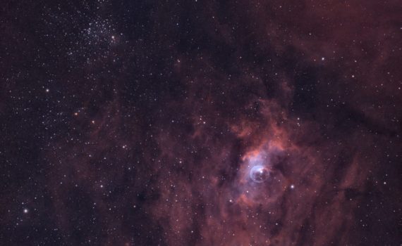 The Bubble Nebula, NGC7635, part of a larger HII could, Sh2-162, in the constellation Cassiopeia with the open cluster M52 in its neighbourhood (top left corner of the image). The “bubble” is produced by the stellar winds from a massive young and hot star, SAO20575, in its center. The bubble […]
