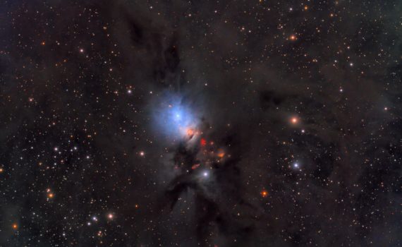 This is NGC1333, a blue reflection nebula surrounded by a dramatic scenery of dark and dusty nebulosity and colorful stars. The red specks of light below the main reflection nebula are Herbig-Haro objects that are produced when jets of gas ejected from newly formed stars hits the surrounding gas and dust […]