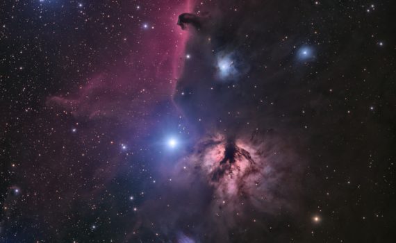 Not too far from the famous Orion Nebula and situated around the star Alnitak, the leftmost of the three stars making up the belt of Orion is an ensemble of bright and dark nebulae. It contains the well-known horsehead nebula, which is a dark dust cloud in front of an […]